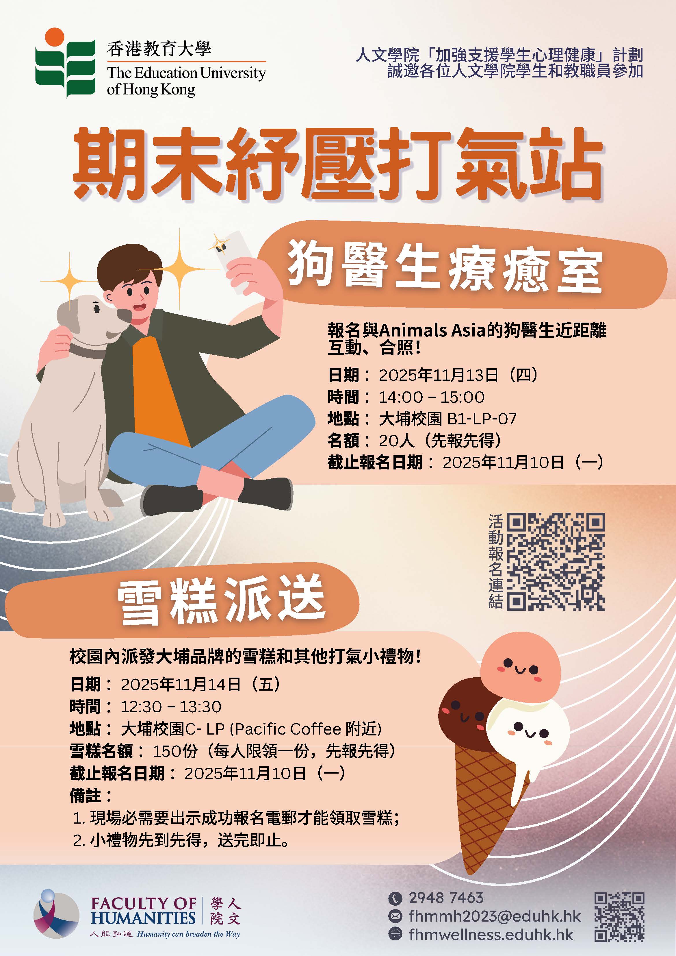 除了狗醫生的陪伴環節外,我們還會在校園內派發大埔品牌的美味雪糕和其他打氣小禮物!讓甜品的美味和毛孩的溫暖,一同為期末衝刺的你加油打氣。